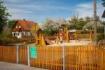 Der Spielplatz ist ringsherum eingezäunt und mit einem Tor versehen. Der Spielplatz ist sauber und unter allen Spielgeräten befindet sich eine dicke Schicht Fallschutzkies.