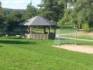 Schön an einem Fahrradweg gelegen, ist der Spielplatz eine willkommene Zwischenstation. Unter Holzpavillion kann man sich setzen.