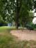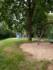 Spielplatz im Dorf mit einigen Spielgeräten und umgeben von alten Bäumen