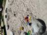 Kleiner Spielplatz mit Sandbereich und Rutsche.