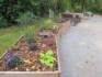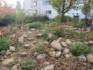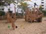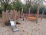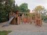 Schöner Spielplatz in einer Siedlung mit aufwendigem Holzklettergerüst. Er gibt zwei weitere Bereiche für die jüngeren. Besonders sind die Hochbeete und ein bepflanzter Hügel.